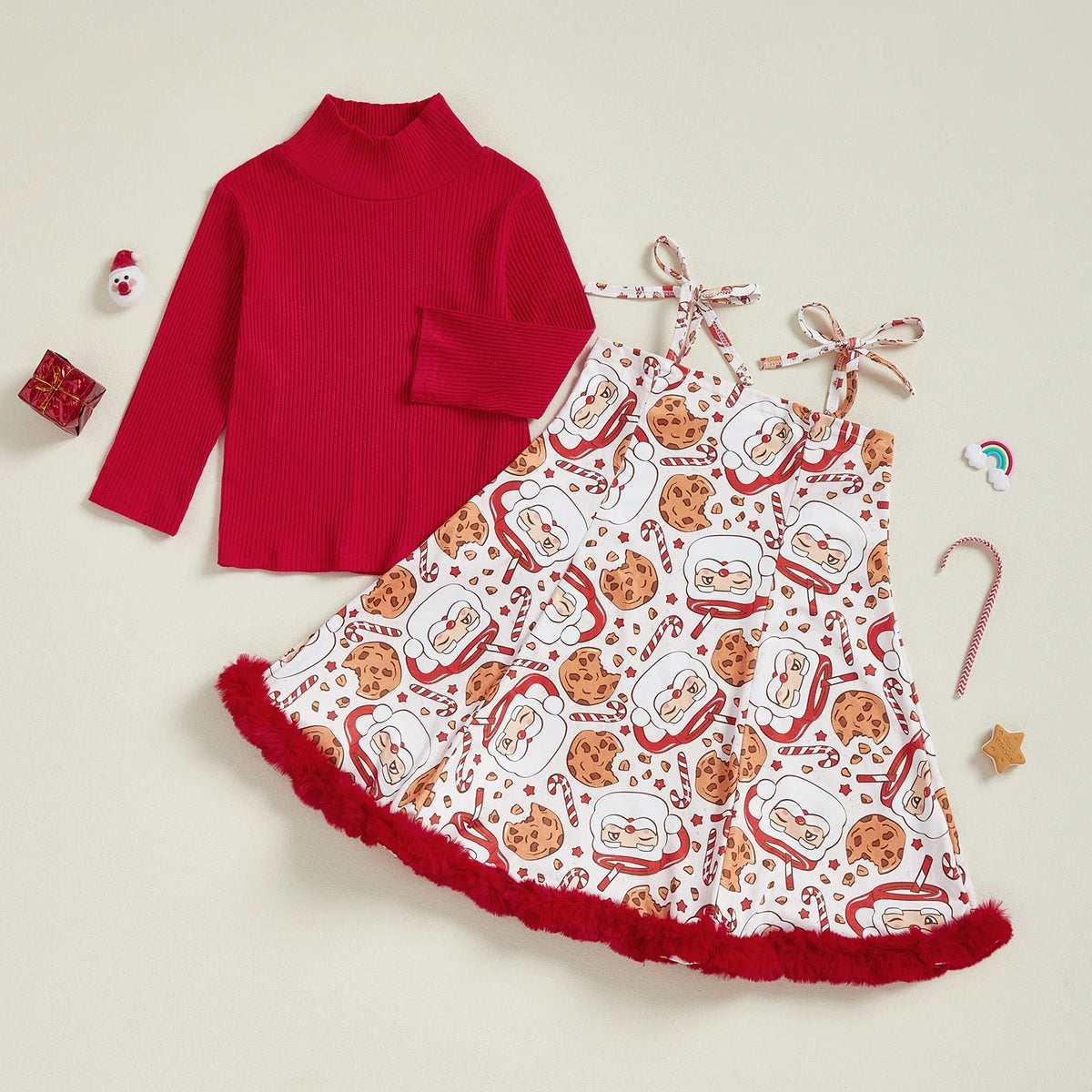 Women s Christmas Outfit Red Plaid Long Sleeve High Neck Ribbed Tops Snowman Print Suspender Skirt Set with Bow Detail