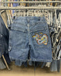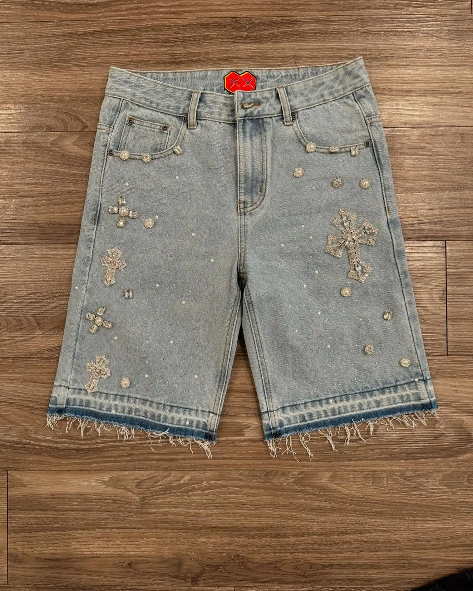 Y2K Gothic Diamond Cross Embroidery Denim Shorts American Retro Blue Gym Shorts Rhinestone Streetwear Hip Hop Men Women Jorts