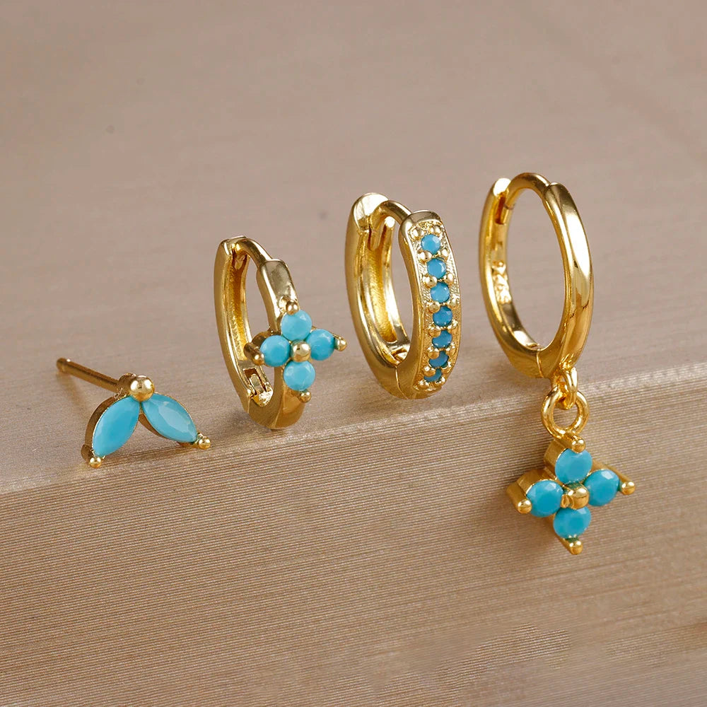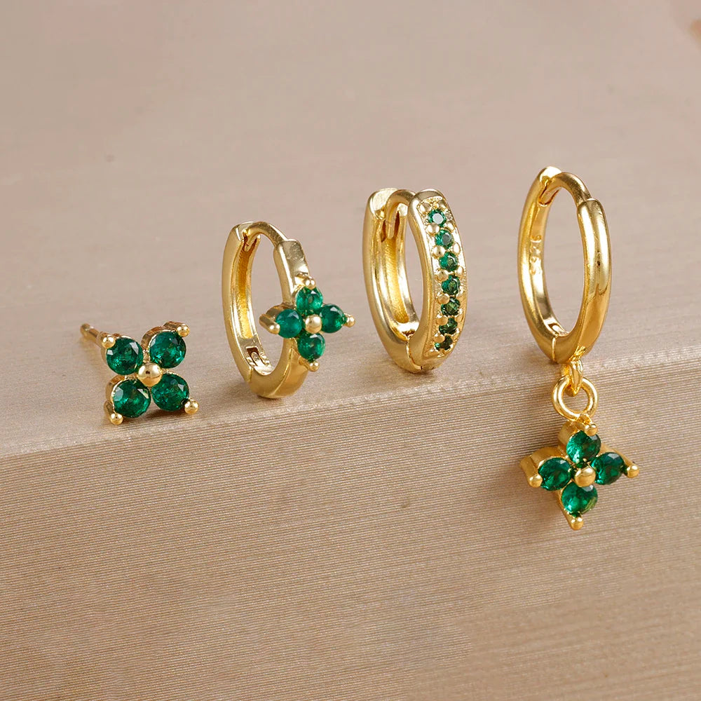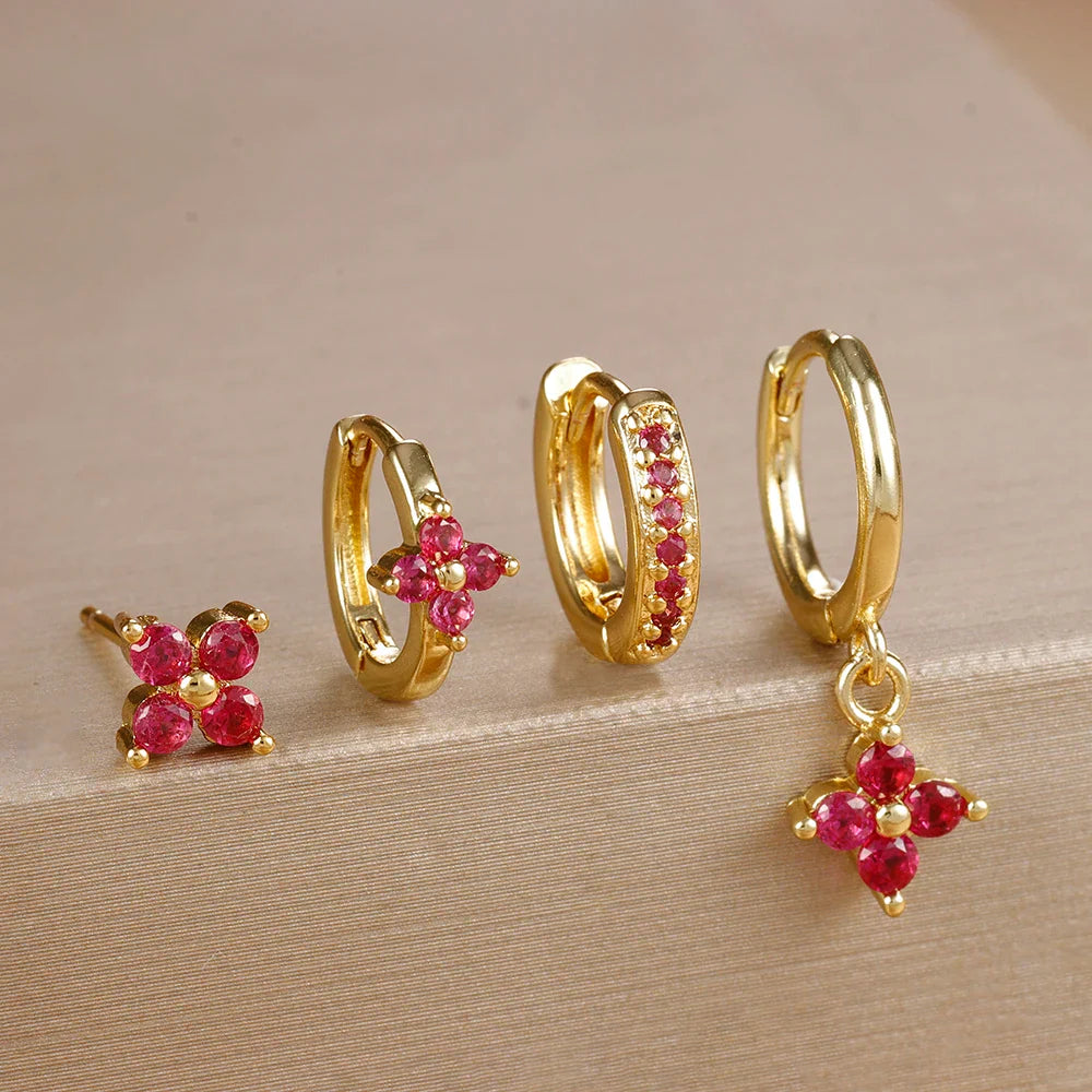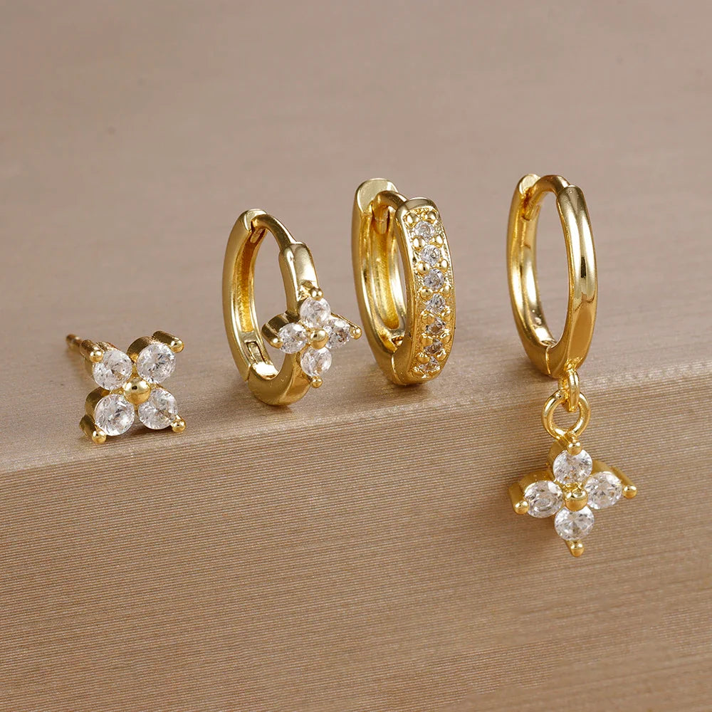 4pcs Fashion Cubic Zirconia Flower Hoop Earrings Set 18K Gold Plated Stainless Steel Stud Earring Piercing Jewelry aretes mujer