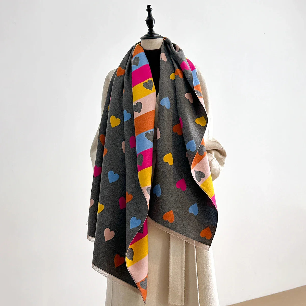 Autumn Winter Retro Imitaion Cashmere Shawl Fashion Woman Versatile Heart Double-sided Color Matching Pashmina Thick Warm Scarf