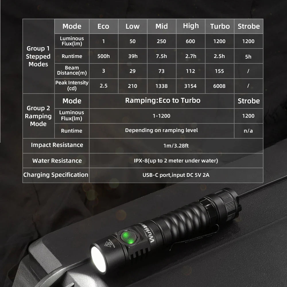 Wurkkos FC11C 519A USB-C Rechargeable EDC 18650 Flashlight Max Output 1200 LM IP68 Waterproof Magnetic Tail Hiking Travel Torch