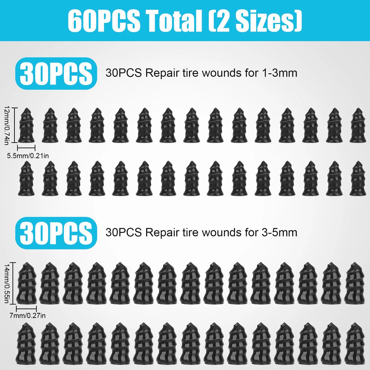 2 Sizes: 60PCS total and we provide 2 sizes of tire repair nails for you, smaller one is approx. 0.21 x 0.46 inch and larger one is about 0.27 x 0.5 inch. Professional puncture repair nails can be used on cars, motorcycles trucks buses, and agricultural tires.